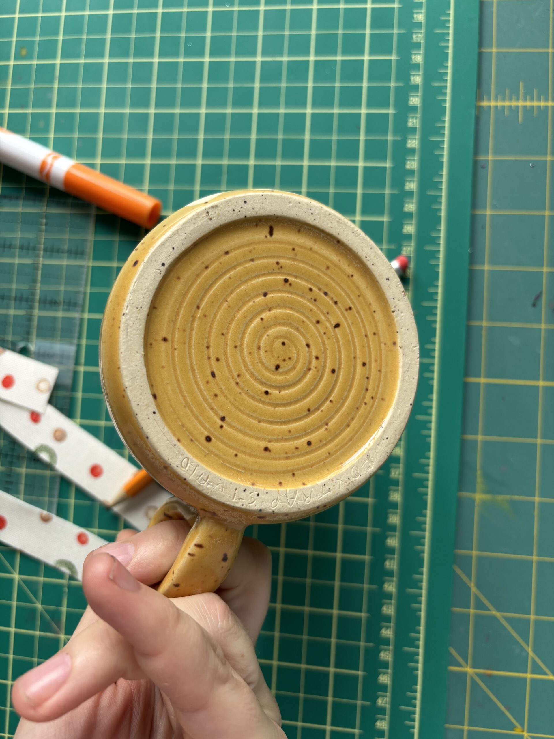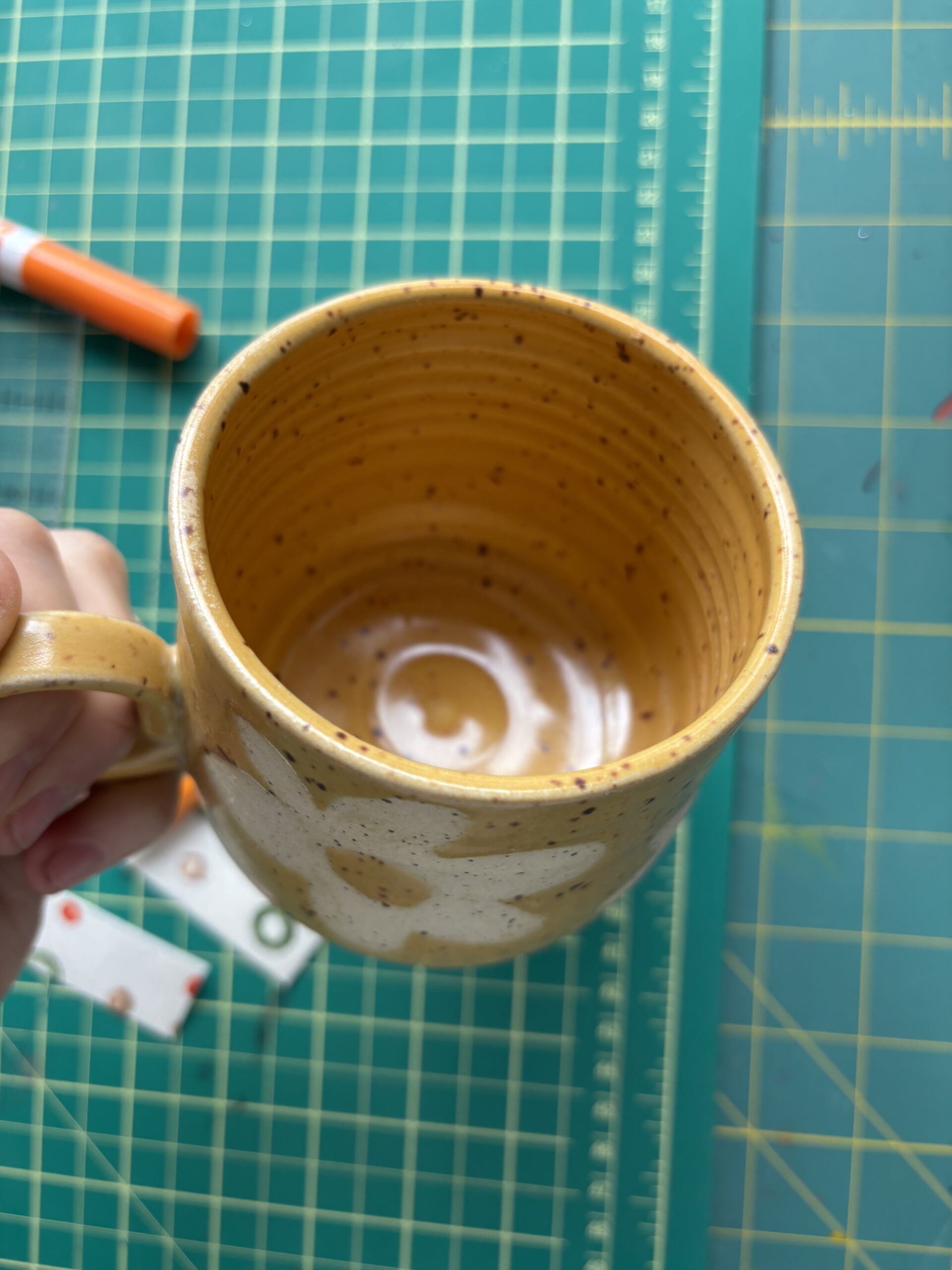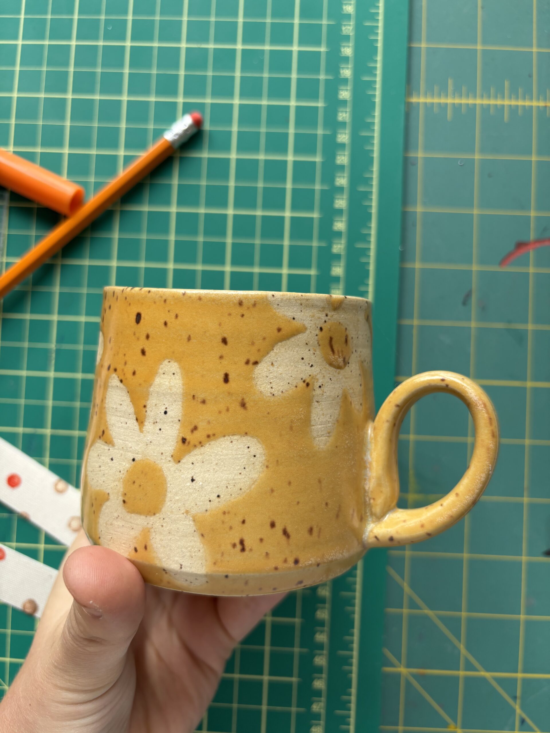 Speckled white clay with a wax resist flower pattern and ochre glaze. This one is a favourite.